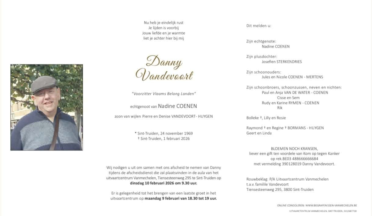 “Zondagavond bereikte ons vanuit de afdeling Landen droevig nieuws” stelt Kurt Moons, voorzitter Vlaams Belang Vlaams-Brabant. “We wisten dat Danny leed aan kanker en slechts een week geleden kregen we te horen dat hij het gevecht tegen de slopende ziekte aan het verliezen was. Toch kwam zijn overlijden in het ziekenhuis in Sint-Truiden zondagavond nog erg plots. Het Vlaams Belang verliest hiermee in Landen één van de mensen die de plaatselijke afdeling terug op de politieke kaart aan het zetten was. Ons medeleven gaat uit naar zijn familie en kennissen. Hij wordt gemist maar we zetten zijn politieke strijd verder.”